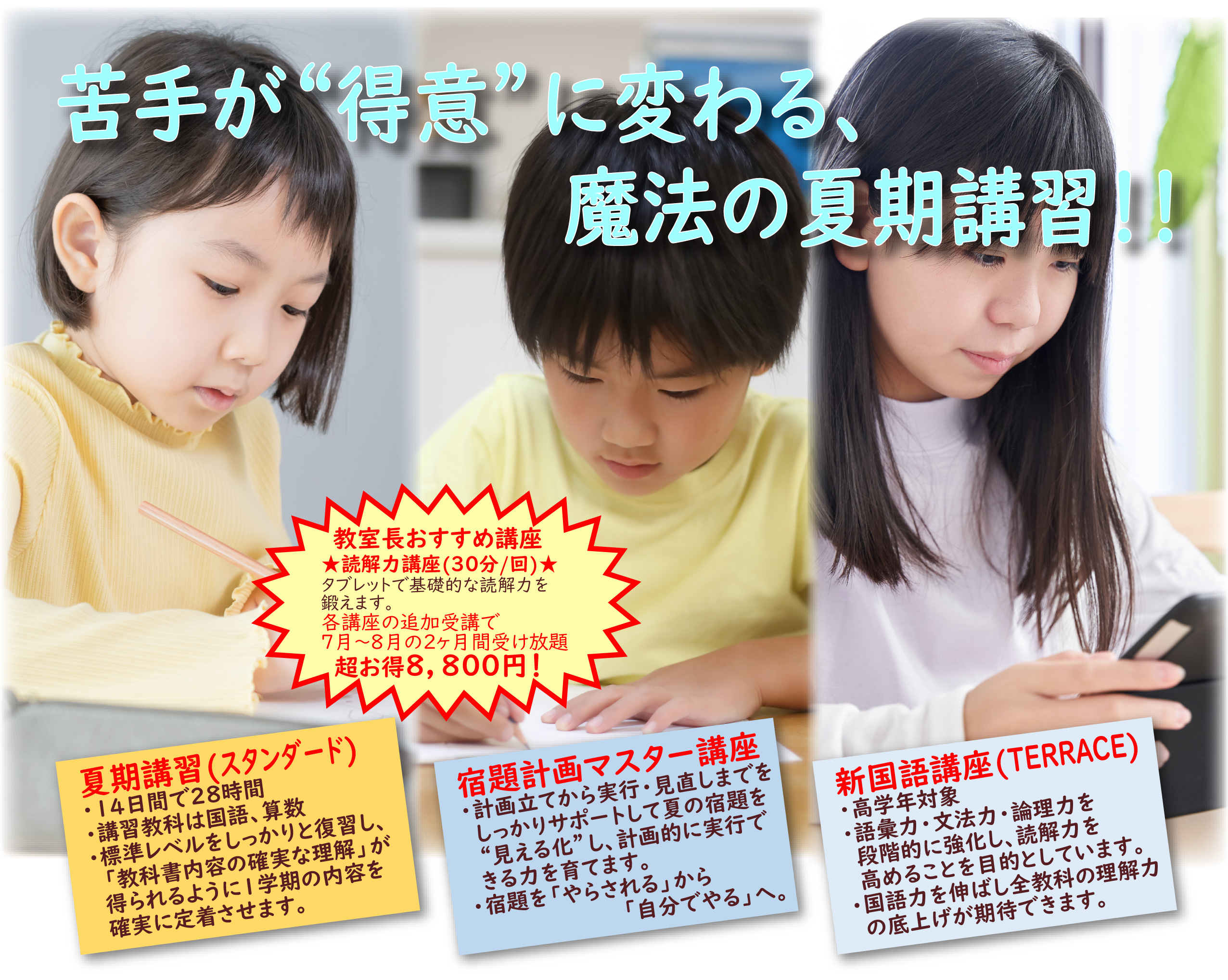 「勉強が苦手…」「夏休みの宿題が進まない…」そんな悩みを魔法のように解決する夏の特別講習がスタートします。